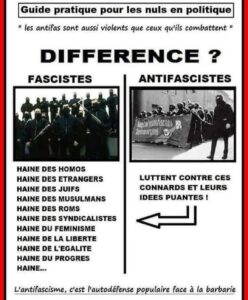 La boucle est bouclée lorsqu’en prenant comme prémisse que considérer le racisme comme un délit est une atteinte à la liberté d’expression Jack le Fou conclut qu’on se dirige vers le fascisme[46]. Là encore, un tel raccourci ne peut que servir les militants d’extrême-droite et leur novlangue donc nous avons dénoncé les effets pervers plus haut (inversion des rôles entre fascistes et antifascistes).