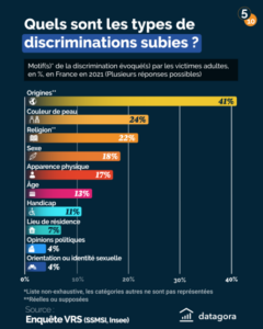 La même enquête Vécu et Ressenti en matière de Sécurité[54] relevait 1 056 000 atteintes discriminatoires à l’encontre d’adultes pour l’année 2021[55]. Les 3 motifs les plus fréquents étant l’origine, la couleur de peau et la religion.